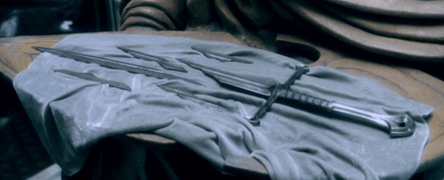 Aragorn undergoes an extreme journey of inner confidence to become the true king he is. His name, Aragorn, in Sindarin – the language of the elves – means ‘noble valour’, thus, allowing Tolkien to predispose Aragorn to readers with connotations of greatness that may not at first be apparent in his actions. The character of Aragorn when first introduced in The Fellowship of Ring does not conform to many aspects of hegemonic masculinity, aligning more with the feminine attributes. However, as his story develops, the masculine elements of himself come into focus—the main one of these is his confidence. His masculinity is represented through the sword Andúril, a common literary and cultural symbol for masculinity due to its highly phallic resemblance. The sword was used in the War of the Last Alliance against Sauron and became the shards of Narsil, kept sacred in Rivendell.